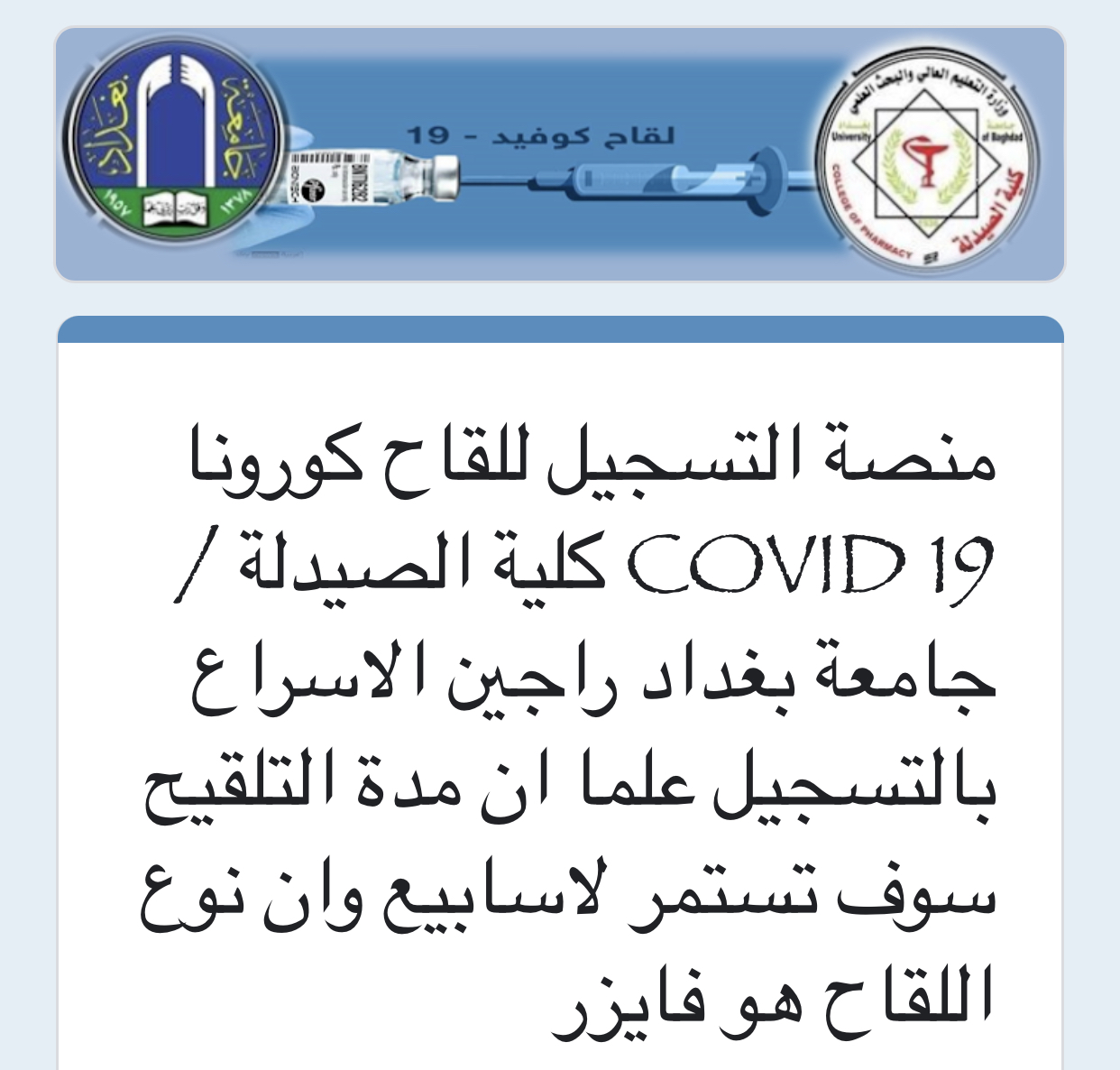 إعلانكونورسينج04/08/2021 إعلان تعلن عمادة كلية الصيدلة/جامعة بغداد وبالتعاون مع كلية التمريض/جامعة بغداد وشعبة التحصين في دائرة صحة الرصافة عن فتح ... المزيد