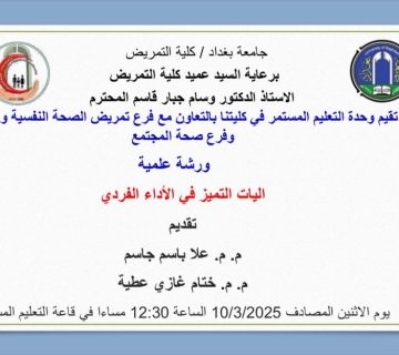 ورشة عمل بعنوان ( اليات التميز في الأداء الفردي )Mwk9209/03/2025برعاية السيد عميد كلية التمريض ( ا.د.وسام جبار قاسم ) المحترم تقيم وحدة التعليم المستمر في كلية التمريض / جامعة ... المزيد