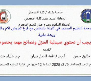 ورشة عمل بعنوان ( ماذا بجب ان تحتوي صيدلية المنزل ونصائح مهمة بخصوصها )Mwk9209/03/2025برعاية السيد عميد كلية التمريض ( ا.د.وسام جبار قاسم ) المحترم تقيم وحدة التعليم المستمر في كلية التمريض / جامعة ... المزيد