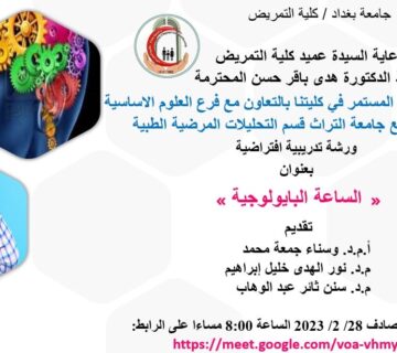 كلية التمريض تنظم ورشة عن الساعة البيولوجيةكونورسينج05/03/2023نظمت كلية التمريض في جامعة بغداد ورشة عمل بعنوان (الساعة البيولوجية) على المنصة الافتراضية (Google Meet (بحضور عدد من التدريسيين ... المزيد