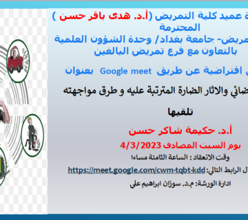 كلية التمريض تنظم ورشة عن التلوث الضوضائي والاثار الضارة المترتبة عليه وطرق مواجهتهاكونورسينج05/03/2023 نظمت كلية التمريض في جامعة بغداد ورشة عمل بعنوان (التلوث الضوضائي والاثار الضارة المترتبة عليه وطرق مواجهتها) على المنصة ... المزيد
