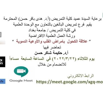 كلية التمريض تعقد ورشة الكترونية عن الكحول وعلاقته بامراض القلبكونورسينج23/03/2022 كلية التمريض تعقد ورشة الكترونية عن الكحول وعلاقته بامراض القلب نظم فرع تمريض البالغين بالتعاون مع وحدة التعليم المستمر ... المزيد
