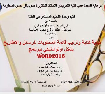 كلية التمريض تنظم ورشة عمل علمية عن كيفية كتابة وترتيب قائمة المحتويات للرسائل والإطاريح بشكل اوتوماتيكي ببرنامج الـ word 2016كونورسينج05/04/2022كلية التمريض تنظم ورشة عمل علمية عن كيفية كتابة وترتيب قائمة المحتويات للرسائل والإطاريح بشكل اوتوماتيكي ببرنامج الـ word 2016 ... المزيد
