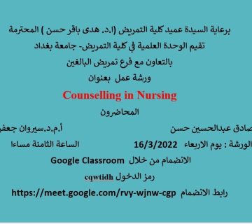 كلية التمريض تنظم ورشة عمل علمية عن المشورة التمريضيةكونورسينج18/03/2022 كلية التمريض تنظم ورشة عمل علمية عن المشورة التمريضية نظم فرع تمريض البالغين بالتعاون مع وحدة التعليم المستمر بكلية ... المزيد