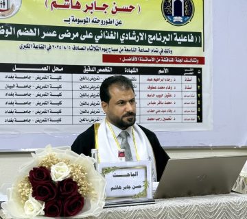 كلية التمريض تناقش أطروحة دكتوراه حول برنامج إرشادي لمرضى عسر الهضمكونورسينج08/08/2025ناقشت كلية التمريض بجامعة بغداد أطروحة دكتوراه بعنوان: “فاعلية البرنامج الإرشادي الغذائي على مرضى عسر الهضم الوظيفي”. للطالب حسن جابر ... المزيد