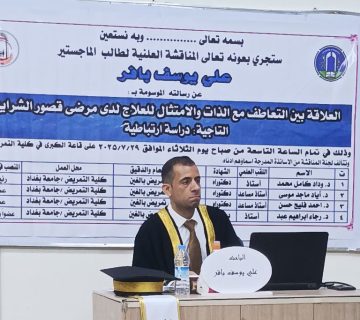 كلية التمريض تناقش العلاقة بين التعاطف الذاتي والالتزام بالعلاج لدى مرضى قصور الشرايين التاجيةكونورسينج07/08/2025ناقشت كلية التمريض بجامعة بغداد رسالة ماجستير بعنوان: “العلاقة بين التعاطف مع الذات والامتثال للعلاج لدى مرضى قصور الشرايين التاجية: ... المزيد