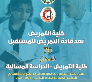 إعلان مهمكونورسينج11/10/2025تعلن كلية التمريض في بغداد عن بدء التقديم على الدراسة المسائية للسنة الدراسية 2025-2026 وذلك وفقاً للضوابط والتعليمات المقدمة في ... المزيد