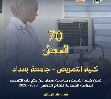 اعلانكونورسينج11/10/2025 فرصتك الأخيرة: لدراسة التمريض في جامعة بغداد (مسائي 2025-2026)هل تبحث عن مهنة إنسانية مرموقة ومستقبل مضمون؟تُعلن كلية التمريض بجامعة بغداد، ... المزيد