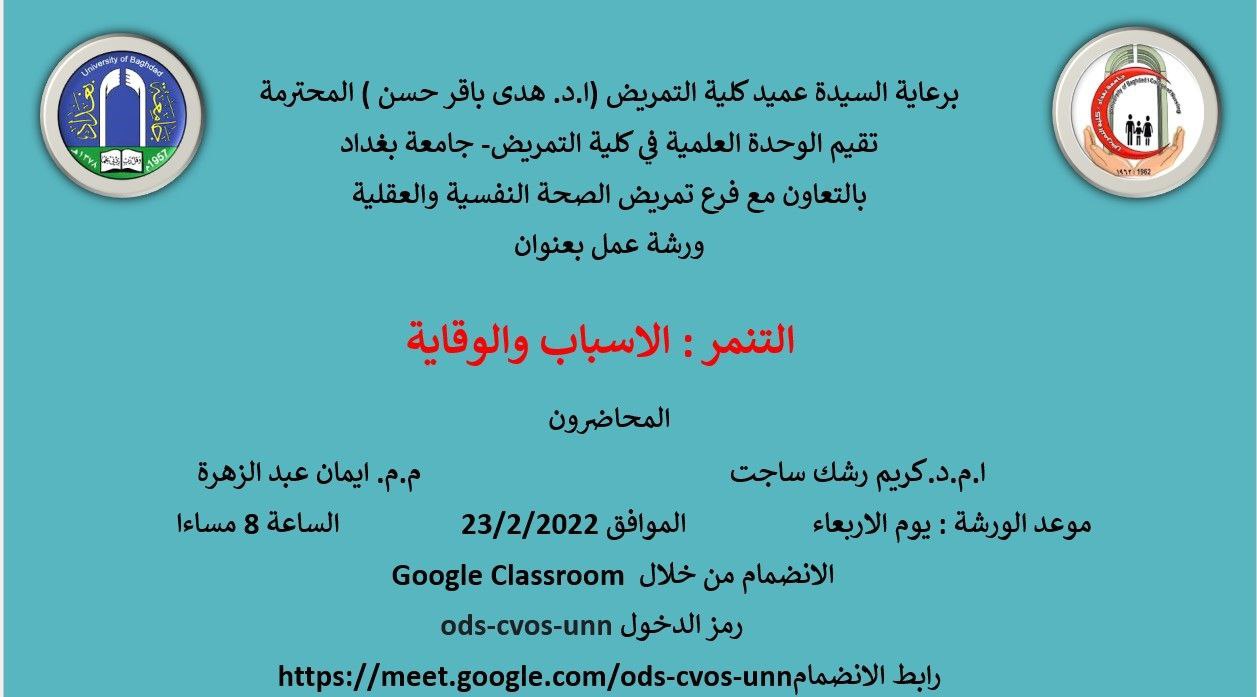 نظمت الوحدة العلمية بالتعاون مع فرع تمريض الصحة النفسية والعقلية في كلية التمريض بجامعة بغداد ورشة عمل بعنوان (التنمر :الاسباب والوقاية).