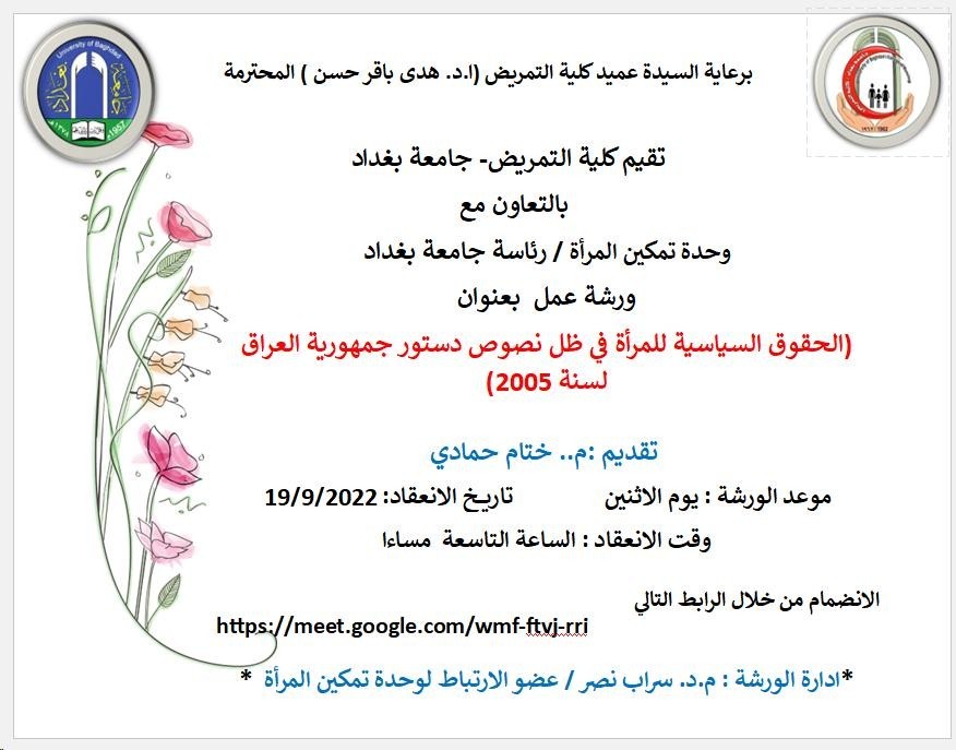 نظمت كلية التمريض في جامعة بغداد ورشة عمل بعنوان (الحقوق السياسية للمرأة في ظل نصوص دستور جمهورية العراق لسنة 2005) على المنصة الافتراضية (Google Meet (بحضور عدد من التدريسيين وطلبة الدراسات العليا .