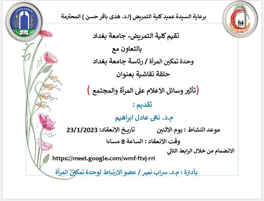 نظمت كلية التمريض بجامعة بغداد حلقة نقاشية بعنوان (تأثير وسائل الاعلام على المرأة والمجتمع ) على المنصة الافتراضية (Google Meet) وبحضور عدد من الأساتذة وطلبة الدراسات العليا والأولية .