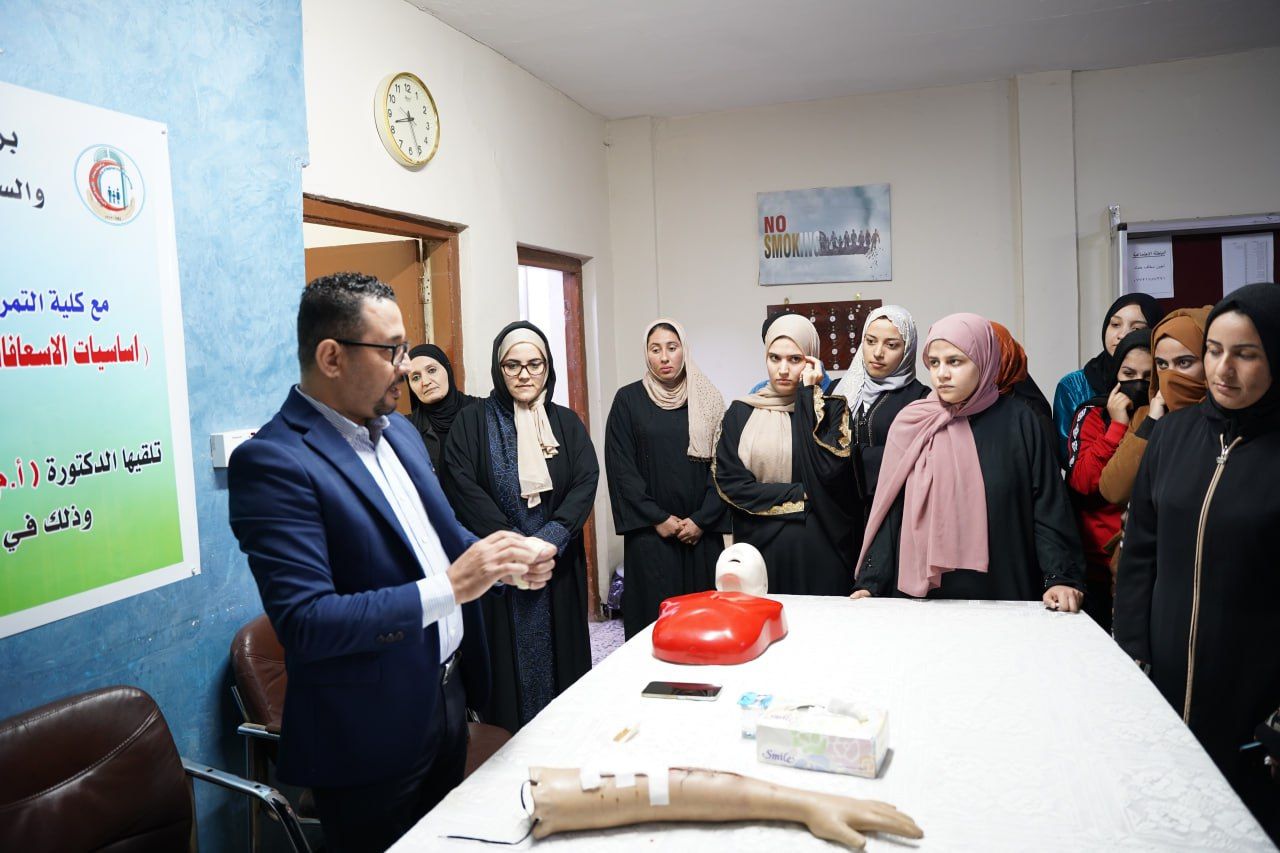 وهدفت الورشة الى التعرف على المبادئ الاساسية للإسعافات الاولية وكيفية التعامل مع المصاب باستخدام ابسط الامكانيات المتاحة لإنقاذ حياة المصاب وتجنب مضاعفات الإصابة.