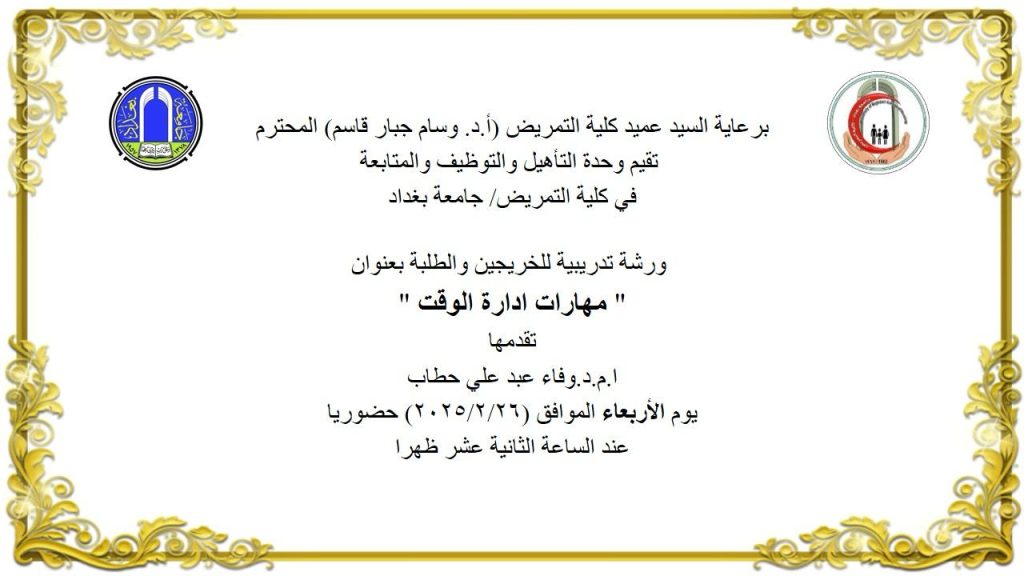 برعاية السيد عميد كلية التمريض ( ا.د وسام جبار قاسم ) المحترم تقيم وحدة التأهيل والتوظيف والمتابعة في كلية التمريض / جامعة بغداد ورشة تدريبية للخريجين والطلبة بعنوان (مهارات إدارة الوقت ) تقدمها ا.م.د وفاء عبد علي حطاب يوم الأربعاء الموافق ٢٠٢٥/٢/٢٦