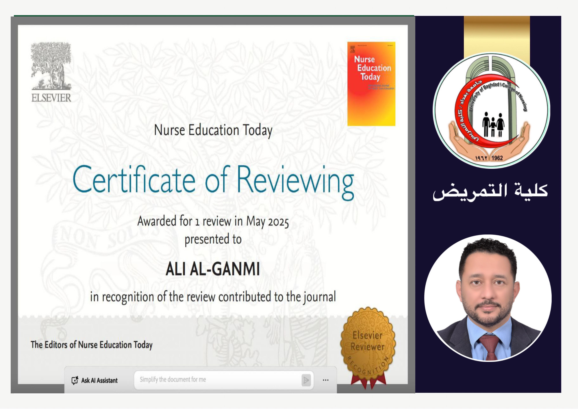 اختير الأستاذ المساعد الدكتور علي حسين علك، التدريسي في كلية التمريض بجامعة بغداد، عضوًا في هيئة مراجعة الأقران (Peer Reviewer) لتقييم بحث علمي في مجلة “Nurse Education Today”، الصادرة عن دار النشر العالمية المرموقة Elsevier.