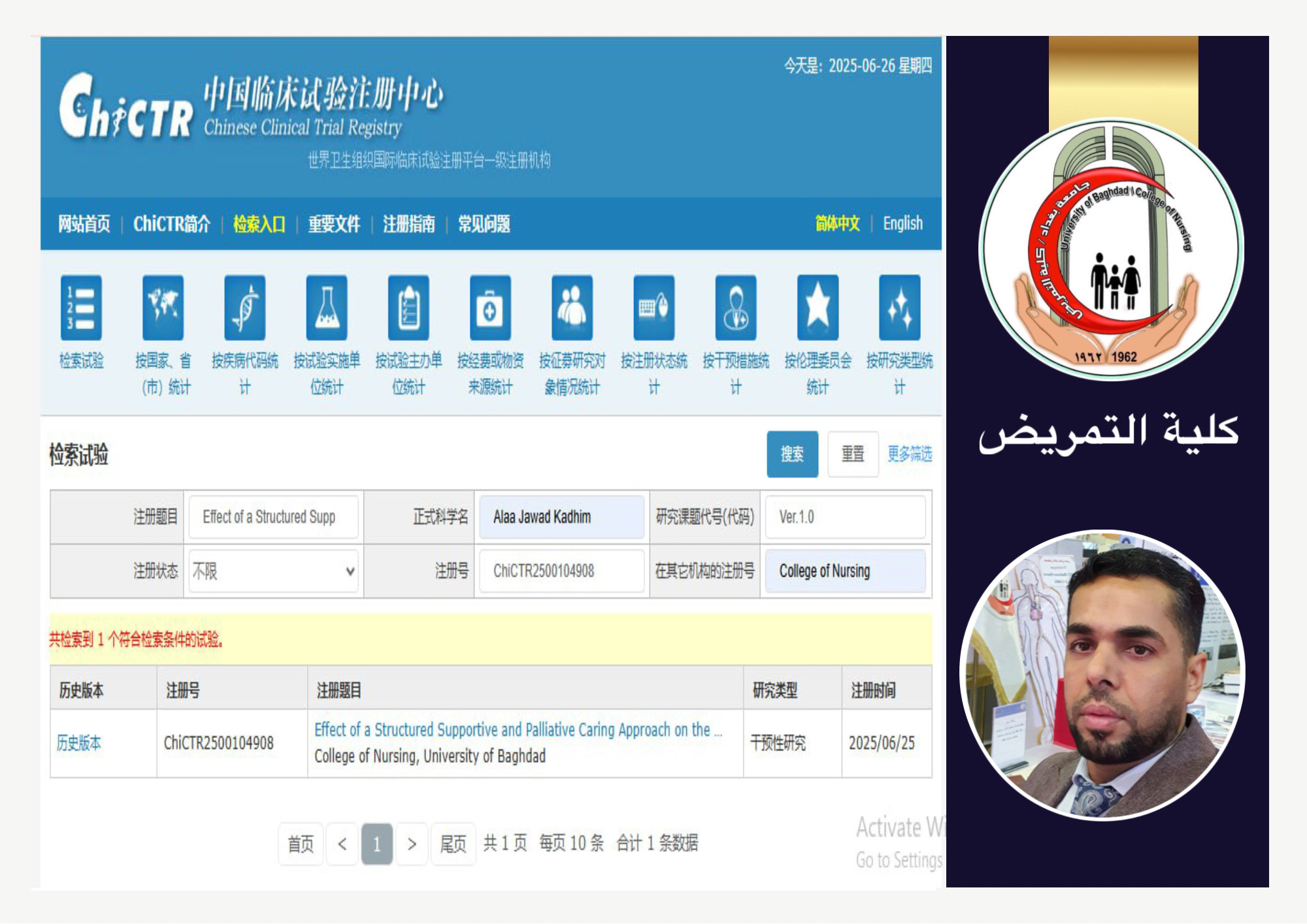 تمكن الأستاذ المساعد الدكتور علاء جواد كاظم، التدريسي في كلية التمريض بجامعة بغداد، من تسجيل تجربة سريرية بحثية مهمة في السجل الصيني للتجارب السريرية الطبية والتمريضية (Chinese Clinical Trial Registry)، وهو السجل الرئيسي للمنصة الدولية لسجلات التجارب السريرية التابعة لمنظمة الصحة العالمية.