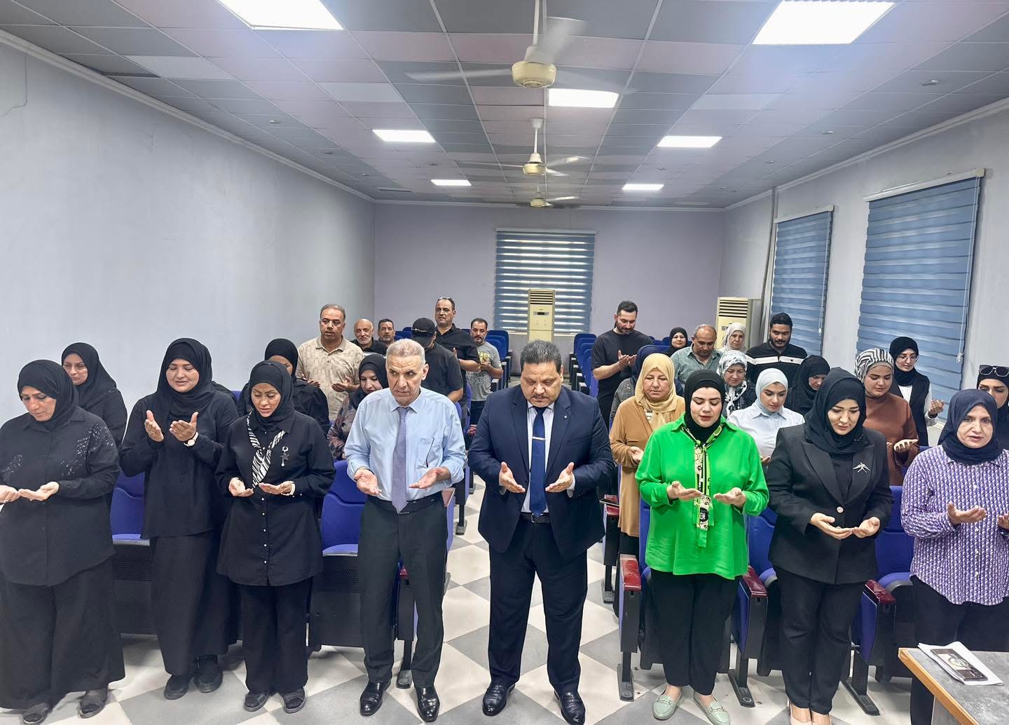 بدأت الوقفة بقراءة سورة الفاتحة على أرواح الشهداء الذين سقطوا ضحية هذه الجريمة النكراء، بحضور عميد الكلية الأستاذ الدكتور وسام جبار والسيد المعاون العميد للشؤون العملية الاستاذ الدكتور زاهد جاسم محمد، وجمع من أعضاء الهيئتين التدريسية والإدارية، في قاعة التعليم المستمر بالكلية.