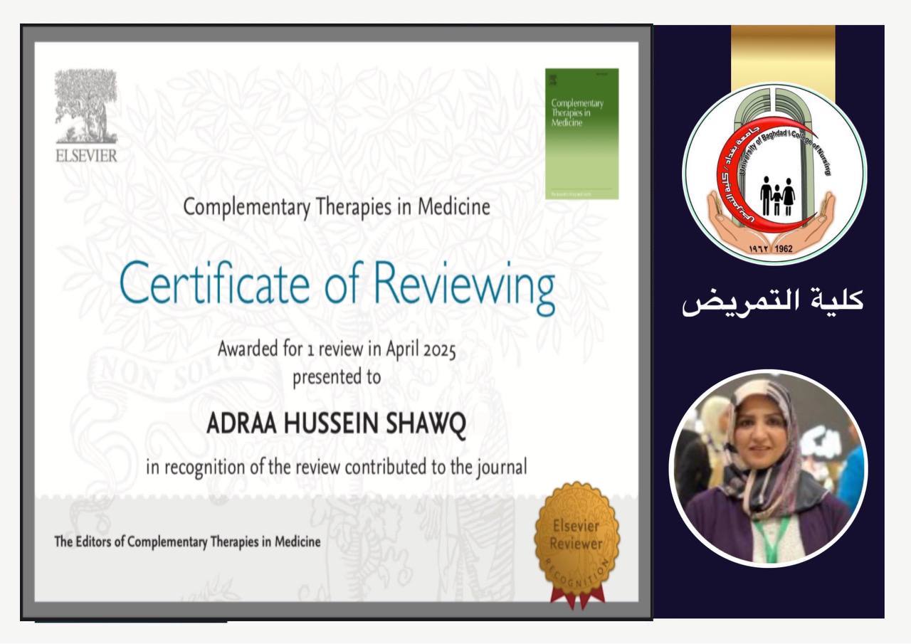 اختيرت الأستاذ المساعد الدكتورة عذراء حسين شوق التدريسية في كلية التمريض بجامعة بغداد عضو مراجعة الاقران لمجلة complementary therapy in medicine والصادرة عن دار النشر العالمية “Elsevier” لتقييم بحث في مجلة ضمن مستوعبات Q2