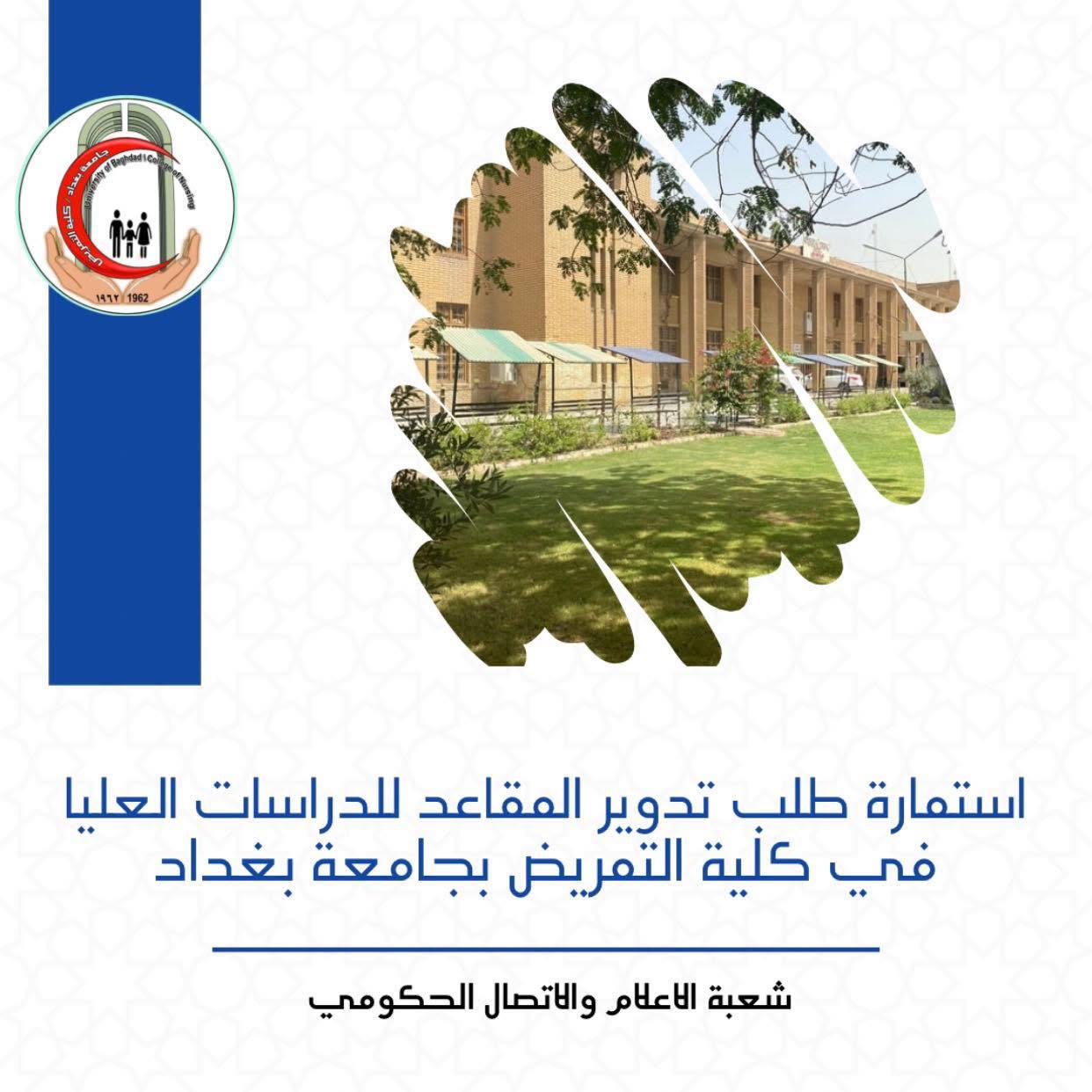 تعلن شعبة الدراسات العليا في كلية التمريض / جامعة بغداد عن فتح منظومة التقديم الالكتروني للتدوير بين قنوات الامتيازات كافة ( ذوي الشهداء بفئاتها الاربعة، والسجناء السياسين، ذوي الاعاقة) للفترة من ٩-٨-٢٠٢٥ ولغاية ١٢-٨-٢٠٢٥ عبر الموقع الالكتروني – بوابة رابط التقديم على الدراسات العليا