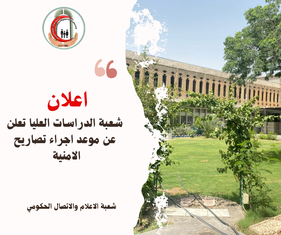 على جميع طلبة الدراسات العليا المقبولين والمشمولين بالأمر الجامعي للقبول مراجعة رئاسة جامعة بغداد، في قاعة نازك عيسى الملائكة بكلية الهندسة، لإكمال إجراءات التصريح الأمني.