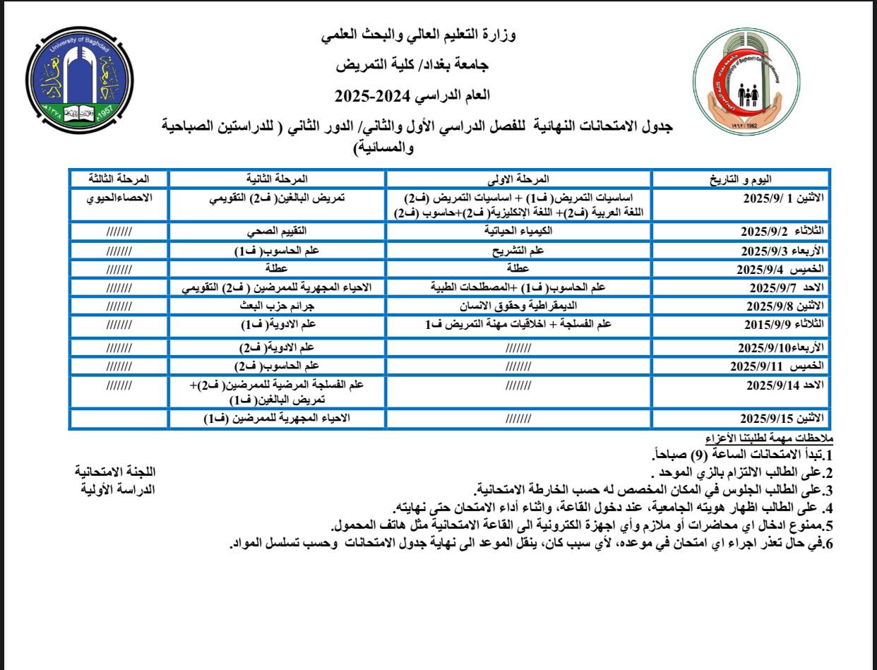 تعلن كلية التمريض بجامعة بغداد عن تعديل جدول الامتحانات النهائية للدور الثاني للفصل الدراسي الأول والثاني للدراستين الصباحية والمسائية