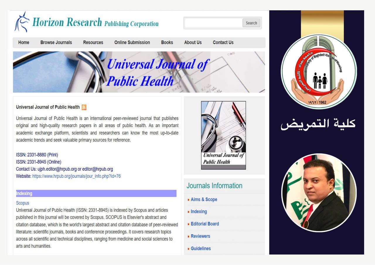 اختير المدرس الدكتور صفد رياض عصام التدريسي في كلية التمريض بجامعة بغداد عضو مراجعة الاقران في مجلة Universal Journal of Public Health