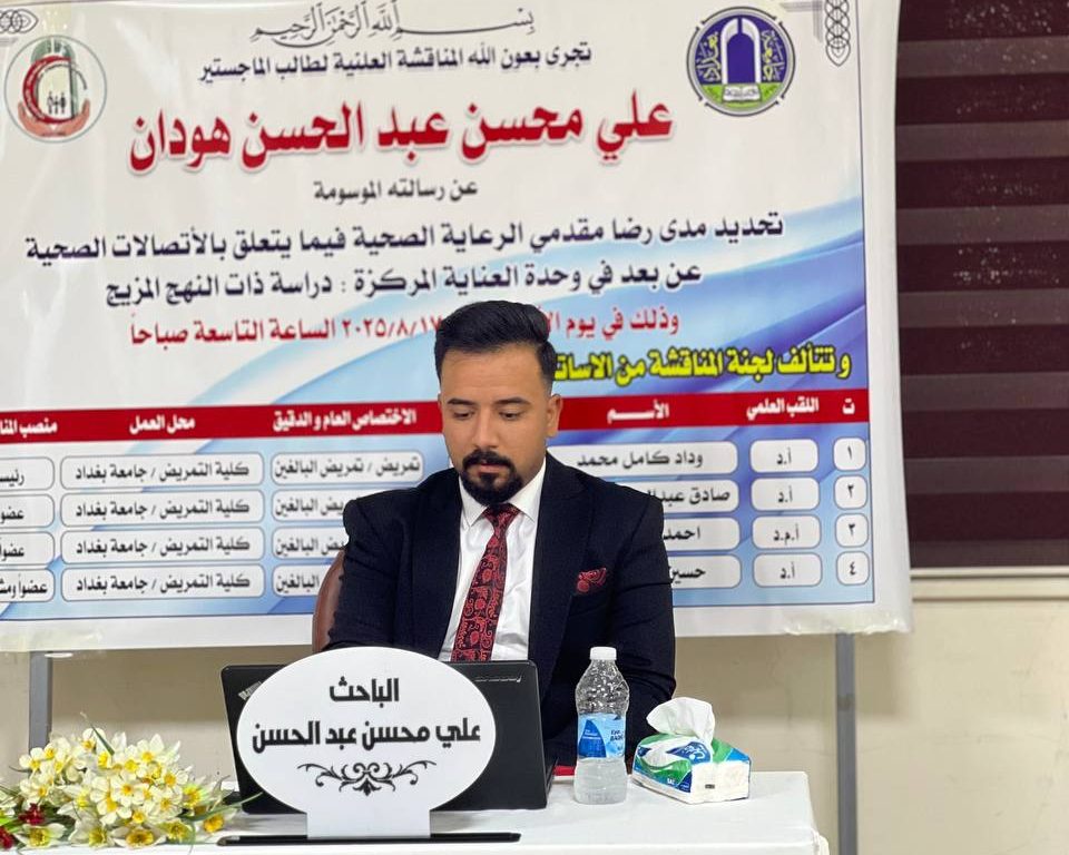 شهدت كلية التمريض بجامعة بغداد مناقشة رسالة الماجستير التي قدمها الطالب علي محسن عبد الحسن، والموسومة “تحديد مدى رضا مقدمي الرعاية الصحية فيما يتعلق بالاستشارات الصحية عن بُعد في وحدة العناية المركزة: دراسة ذات منهج مختلط”. جرت المناقشة بإشراف الأستاذ الدكتور حسين هادي عطية في قاعة الدراسات العليا بالكلية