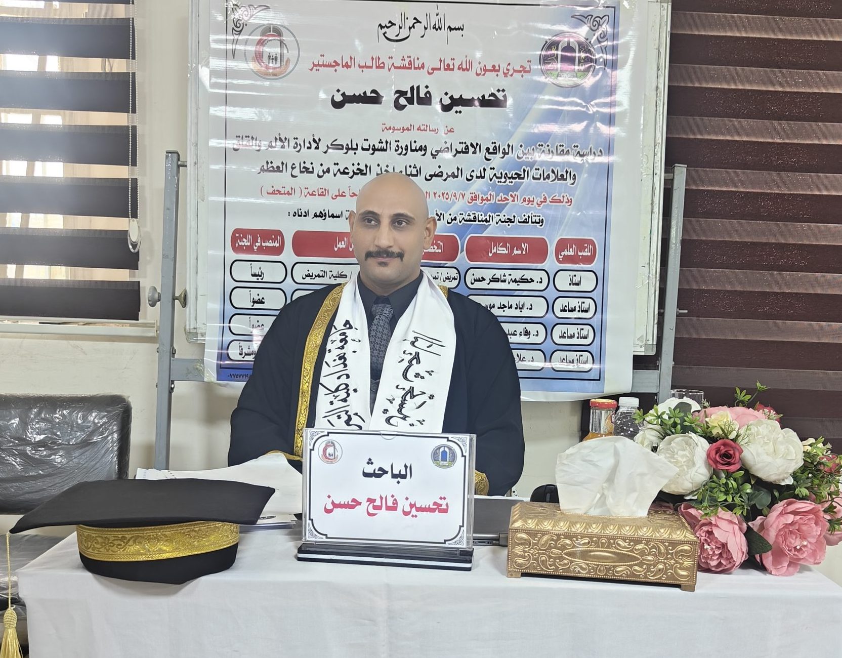 ناقشت كلية التمريض في جامعة بغداد رسالة ماجستير بعنوان “دراسة مقارنة بين الواقع الافتراضي ومناورة “الشوت بلوكر” لإدارة الألم والقلق والعلامات الحيوية لدى المرضى أثناء أخذ الخزعة من نخاع العظم” للطالب تحسين فالح حسن بإشراف الاستاذ مساعد الدكتور علاء جواد في قاعة الدراسات العليا بالكلية