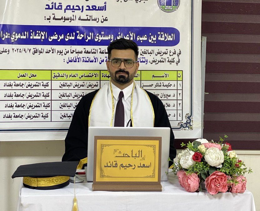 ناقشت كلية التمريض بجامعة بغداد رسالة ماجستير بعنوان “العلاقة بين عبء الأعراض ومستوى الراحة لدى مرضى الغسيل الكلوي: دراسة مقطعية” للطالب أسعد رحيم قائد بإشراف الأستاذ الدكتور حسين هادي عطية في قاعة المتحف بالكلية.