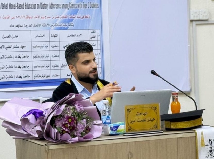 ناقشت كلية التمريض في جامعة بغداد بنجاح رسالة ماجستير بعنوان: “نجاعة التعليم القائم على نموذج المعتقدات الصحية في الالتزام الغذائي لدى الأفراد المصابين بداء السكري من النوع الثاني”. للطالب حيدر نعمت أمين، بإشراف الأستاذ الدكتور وسام جبار قاسم في القاعة الكبرى بالكلية