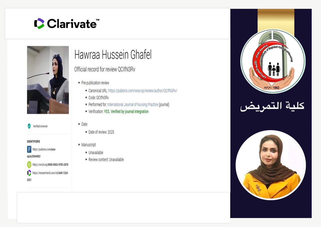 حصلت الأستاذة الدكتورة حوراء حسين غافل، التدريسية في كلية التمريض، على لقب “مقيم معتمد” من منصة Clarivate العالمية. يأتي هذا الاعتماد تقديرًا لدورها الفعّال في مراجعة الأبحاث العلمية المنشورة في العديد من المجلات الدولية المرموقة.
