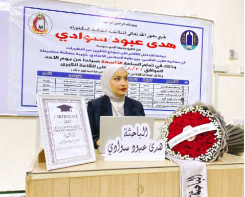 ناقشت كلية التمريض بجامعة بغداد أطروحة الدكتوراه الموسومة “نجاعة التداخل القائم على نموذج التغيير عبر النظريات في معالجة الكرب النفسي بين طلبة السادس الإعدادي: تجربة مُعشاة مُنضبطة”.للطالبة هدى عبود سوادي، بإشراف الأستاذ المساعد دكتورة ايمان حسين علوان في القاعة الكبرى بالكلية.