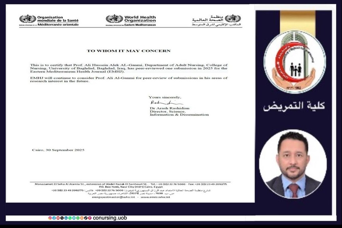 اختير الأستاذ المساعد الدكتور “علي حسين علك” التدريسي في كلية التمريض في جامعة بغداد عضو مراجعة الاقران لتقيم بحث في مجلة