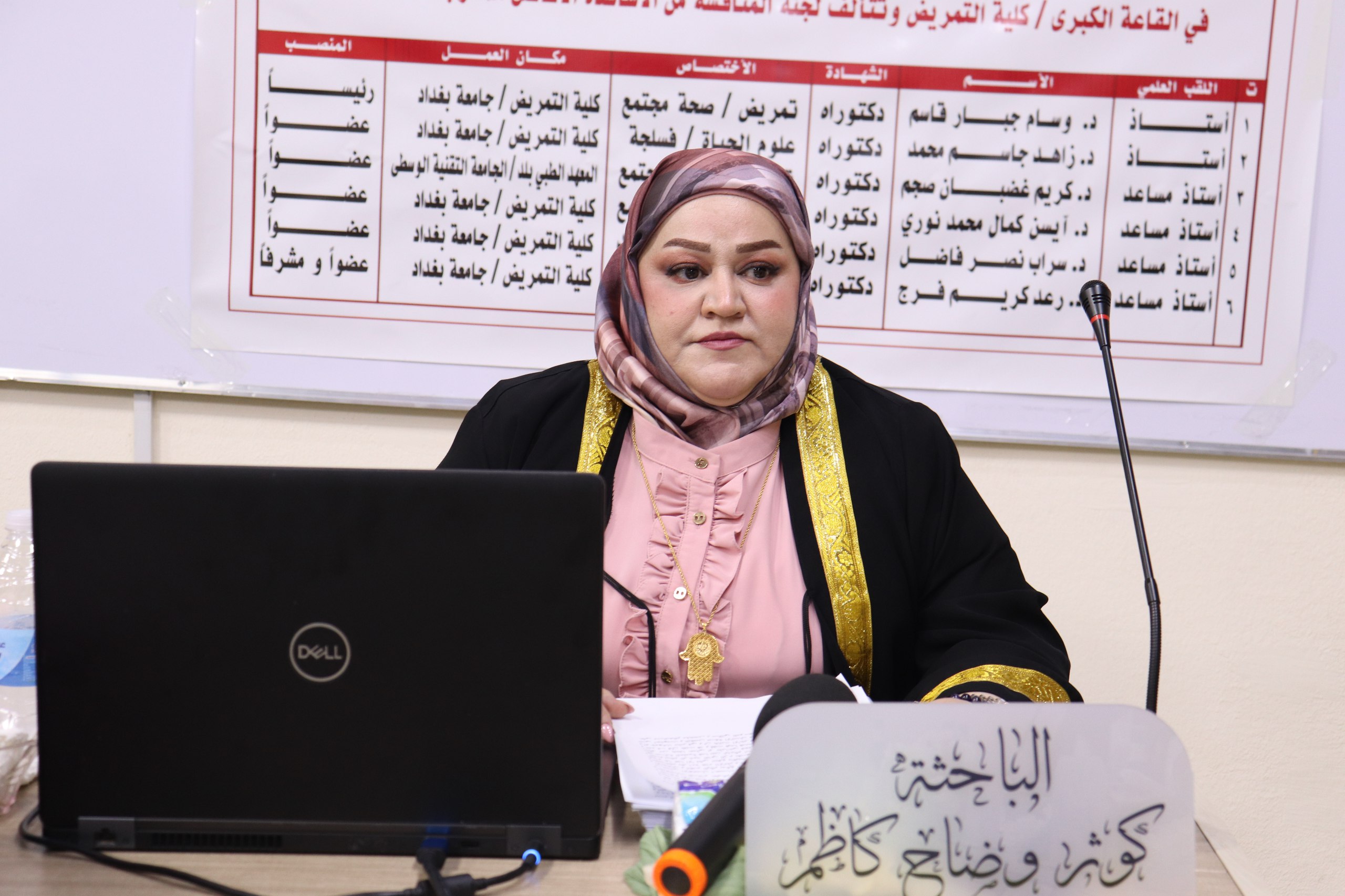 ناقشت كلية التمريض في جامعة بغداد أطروحة الدكتوراه الموسومة ” فاعلية برنامج تعليمي في تحسين تدبير الآباء لأطفالهم المصابين بالناعورية (الهيموفيليا)” للطالبة كوثر وضاح كاظم، تحت إشراف الأستاذ المساعد الدكتور رعد كريم فرج، في القاعة الكبرى بالكلية.