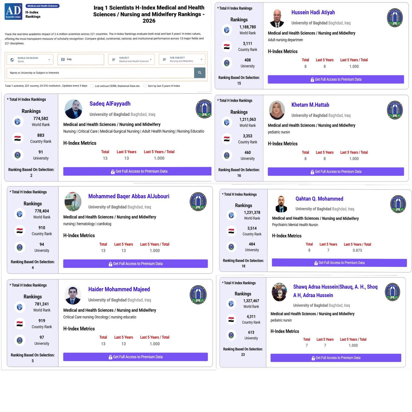 حققت كلية التمريض في جامعة بغداد إنجازًا علميًا جديدًا بتصدّر عدد من تدريسيها قائمة أفضل الباحثين في العراق في تخصص التمريض والقبالة، ضمن تصنيف مؤشر AD العلمي العالمي (AD Scientific Index) لعام 2026.