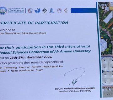 ناقشت كلية التمريض بجامعة بغداد رسالة الدبلوم عال بعنوان “الممارسات التمريضية القائمة على الأدلة تجاه الضغط الإبري لتقليل القلق المتعلق بمرضى تداخلات القلب” للطالبة نور ناظم عبيد. بإشراف على الرسالة الأستاذ المساعد الدكتورة نور الهدى خليل في قاعة التعليم المستمر في الكلية
