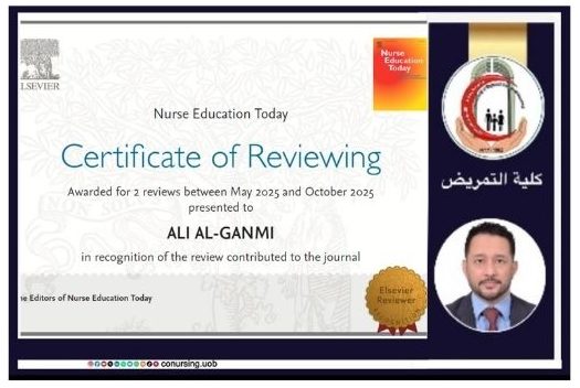اختيار الأستاذ المساعد الدكتور علي حسين علك، التدريسي في كلية التمريض بجامعة بغداد، مقومًا علميًا (محكِّمًا) لبحث علمي في مجلة “NURSE EDUCATION TODAY” الأيرلندية، التابعة لمؤسسة النشر العالمية “Elsevier”.