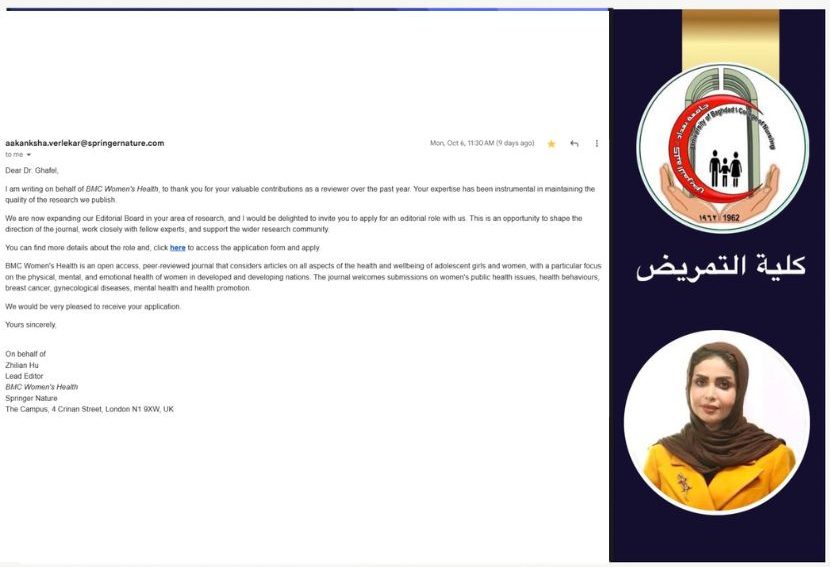 تلقت الأستاذ الدكتورة حوراء حسين غافل التدريسية في كلية التمريض بجامعة بغداد دعوة رسمية للانضمام إلى عضوية هيئة تحرير مجلة “BMC Women’s Health” العلمية المُحكّمة.
