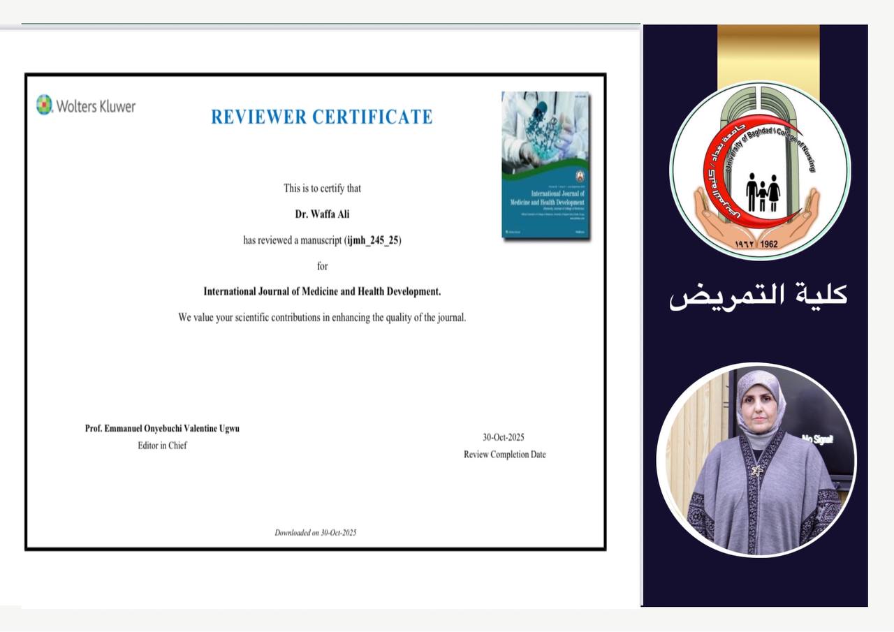 اختير الأستاذ المساعد الدكتور وفاء عبد علي حطاب التدريسية في كلية التمريض بجامعة بغداد عضو مراجعة الاقران والصادرة عن دار النشر العالمية “Journal of Nature and Science of Medicine” لتقيم بحث في مجلة Wolters Kluwer