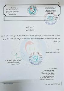 في إطار تعزيز التعاون العلمي والأكاديمي المشترك مع وزارة الصحة والبيئة العراقية، شارك أساتذة كلية التمريض بجامعة بغداد في اللجنة المشرفة على انتخابات نقابة التمريض (الدورة الثانية)، وذلك بإشراف ومتابعة مباشرة من قبل رئيس لجنة عمداء كليات التمريض في العراق، الأستاذ الدكتور وسام جبار قاسم.