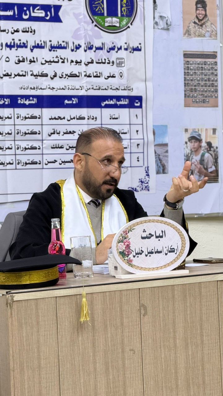 ناقشت كلية التمريض بجامعة بغداد رسالة الماجستير الموسومة (تصورات مرضى السرطان تجاه تنفيذ حقوق المرضى ورضاهم عن جودة الرعاية التمريضية: دراسة ارتباطية)، للباحث أركان إسماعيل خليل، بإشراف الأستاذ الدكتور صادق عبد الحسين الفياض، وذلك على قاعة الكلية الكبرى.