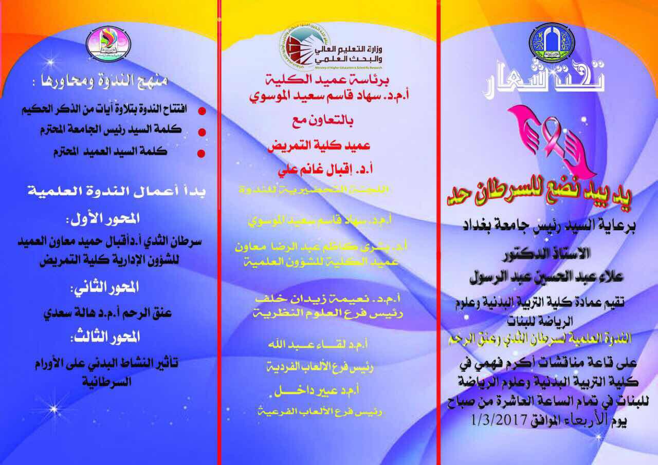 تحت شعار يد بيد نضع حد للسرطان نظمت كليه التربيه البدنيه وعلوم الرياضه للبنات جامعه بغداد بالتعاون مع عمادة كليه التمريض جامعه بغداد الندوة العلميه( بعنوان سرطان الثدي وعنق الرحم )ولقد حضر الندوة عميد كليه الفنون أ.د قاسم مؤنس ممثل عن رئيس الجامعه أ.د علاء عبد الحسين عبد الرسول المحترم.
