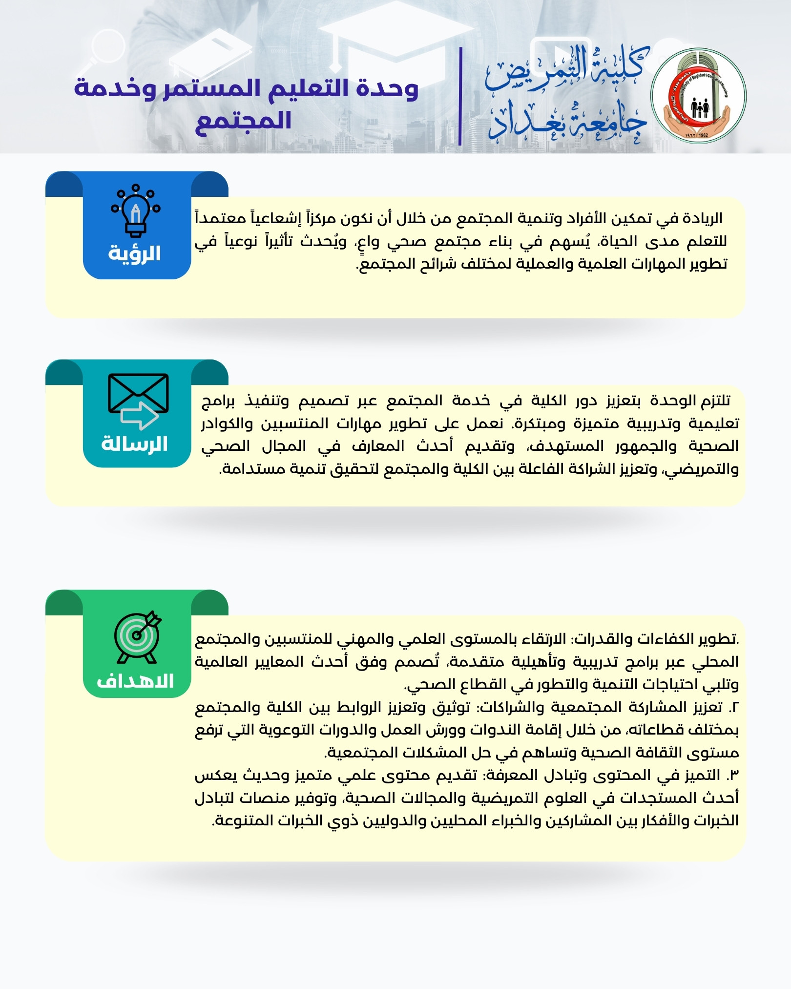 1.تسعى وحدة التعليم المستمر في كلية التمريض الى تكوين نواة إبداعية فاعلة يستضيء بها ويلتجأ اليها كل من يرغب في تطوير مهاراته العلمية والفكرية والعملية والابداعية من تدريسيين وموظفين وطلبة.