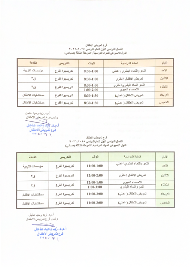 تعد مادتي تمريض الأطفال و النمو والنماء البشري من المواد الاساسية الدراسية المقدمة لطلبة المرحلة الثالثة \ الدراسة الاولية و تدرس بنظام فصلي واحد , بالإضافة الى تدريس طلبة الدراسات العليا (الماجستير والدكتوراه) .