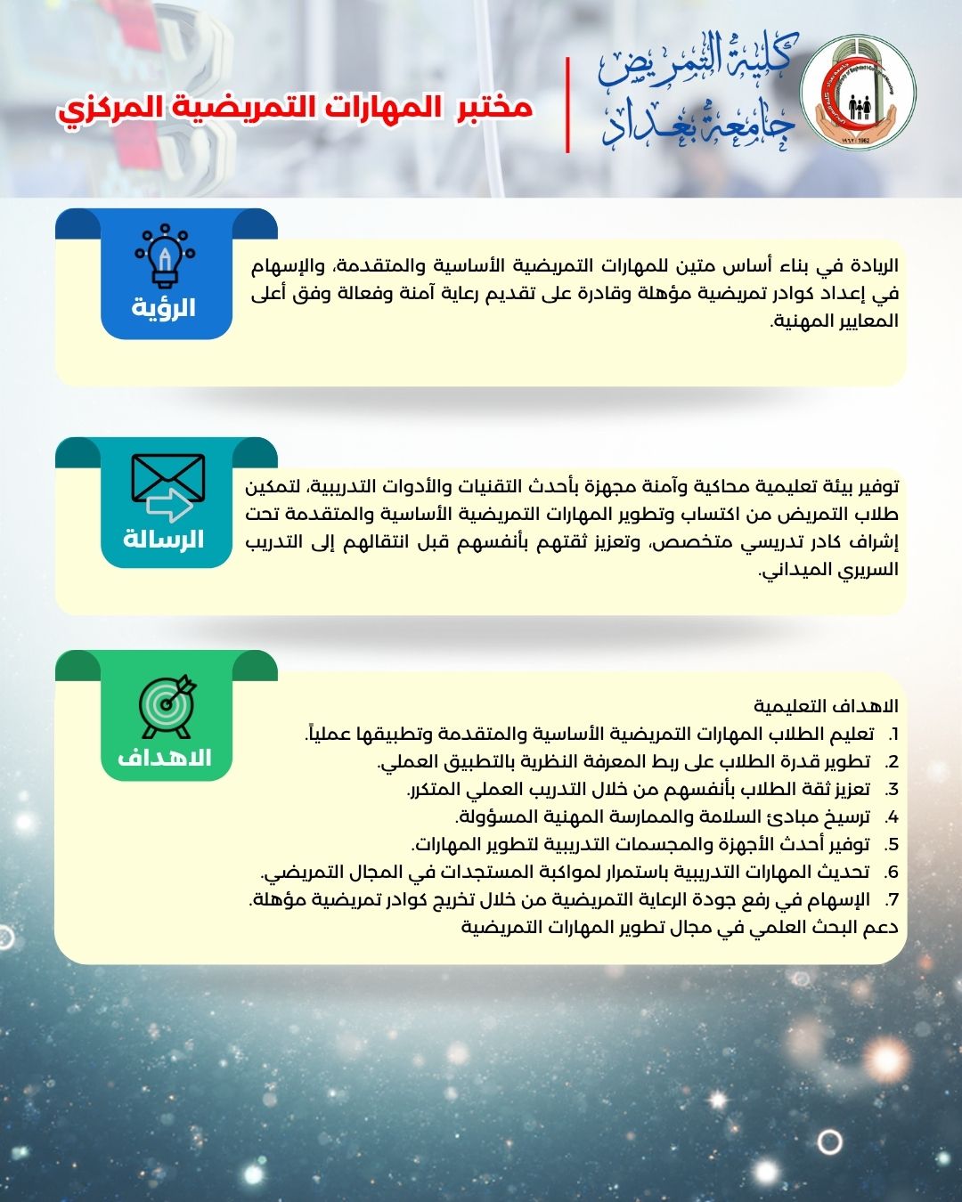 و لا شك أن توفير بيئة تحاكى بيئة المستشفيات والمؤسسات الصحية من خلال الحرص على إعداد مختبرات مجهزة بشكل يشبه إلى حد كبير تلك المؤسسات من شأنه أن ويساهم في رفع الأداء المهني والفني لدى طلبة التمريض وهذا ما يدفع الكلية إلى السعي جاهدة لمواكبة كل ما هو جديد ويناسب العصر.