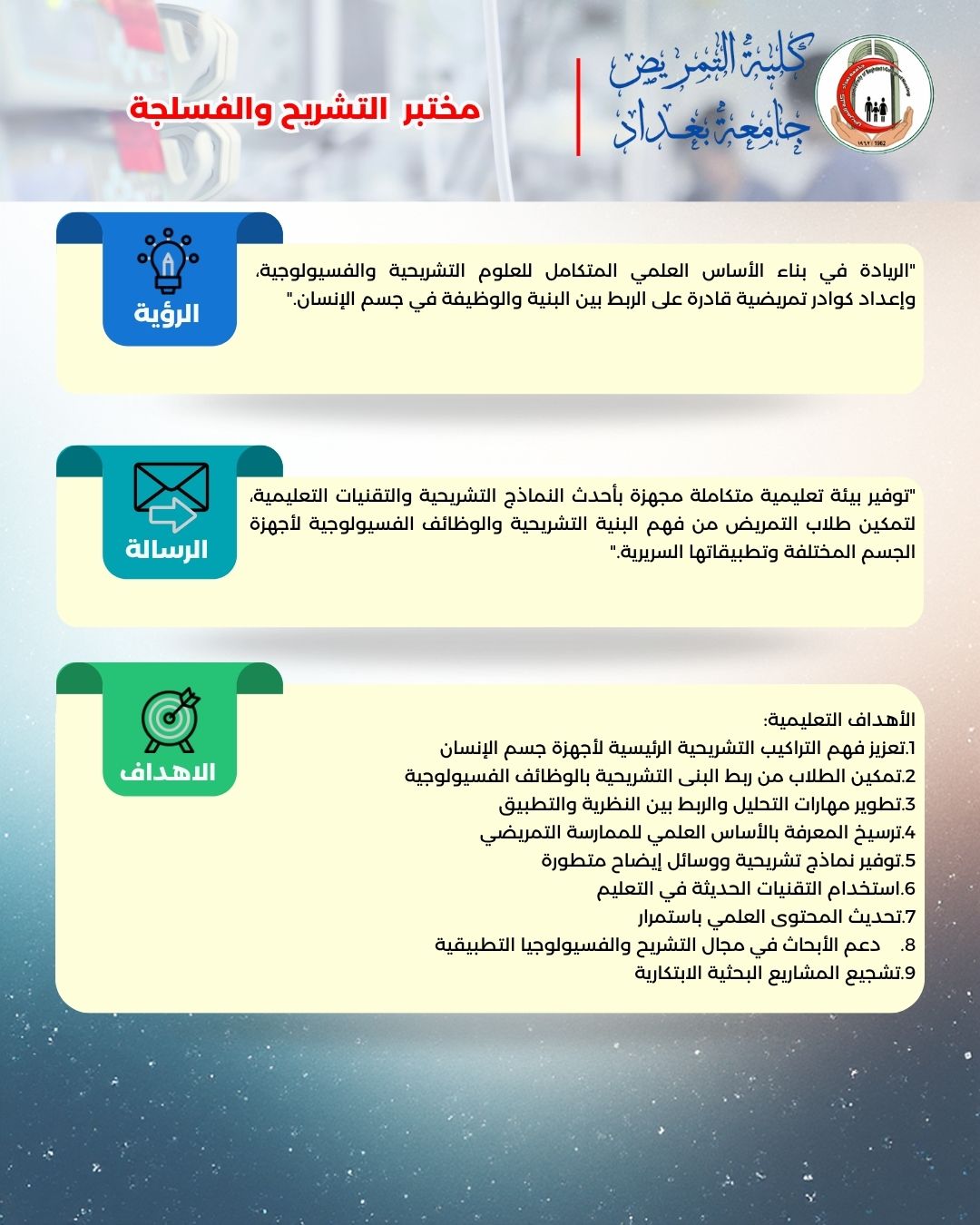 يعد هذا المختبر من المختبرات الأساسية المهمة لطلبة كلية التمريض أذ يساعد الطالب على الألمام بمادة التشريح ومادة الفسلجة من ناحية عملية علمية فيساعده في التعرف على اعضاء الجسم المختلفة التي تنتظم ضمن اجهزة systems بالاضافة الى اجراء بعض الفحوصات الضرورية التي تتعلق بعمل الممرض الجامعي في المستشفيات.