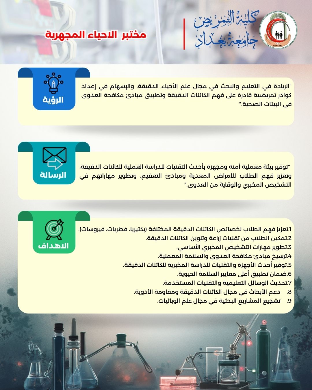 يعد هذا المختبر من المختبرات الأساسية المهمة لطلبة كلية التمريض أذ يساعد الطالب على الألمام بمادة الأحياء المجهرية من ناحية عملية علمية فيساعده في التعرف على مسببات الأمراض من الأحياء المجهرية المختلفة مثل البكتريا والطفيليات والفطريات والفايروسات وغيرها .