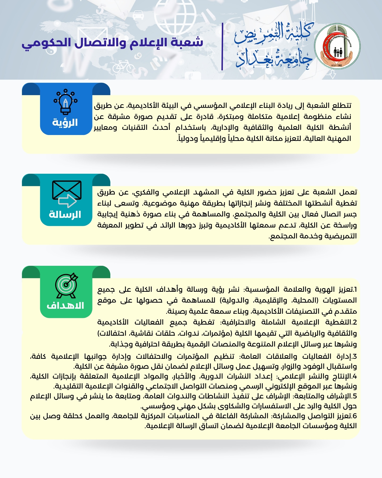 تعد شعبة الاعلام والاتصال الحكومي جزءا حيويا من أجزاء الكلية حيث تعتبر واجهة الكلية للعالم الخارجي لما له دور في تغطية وتسليط الضوء على مجمل النشاطات والفعاليات لكلية التمريض والعمل على تمويل تلك النشاطات والفعاليات ليطلع عليها الجميع وليتعرف من خلالها على ما تقوم به كلية التمريض وما تقدمه من خدمات في مختلف المجالات للجميع. فضلاً عن تحقيق أهداف الكلية وسياستها وأنشطتها المختلفة ومخرجاتها إعلامياً وإبراز هويتها التعليمية والأكاديمية بالشكل المطلوب وتقوية وتدعيم علاقة العمادة بمنتسبيها ومجتمعها الخارجي وترسيخ المفاهيم الإيجابية عنها وإبراز منجزاتها لتعزيز مكانتها وتوثيق علاقاتها مع الجهات المختلفة.