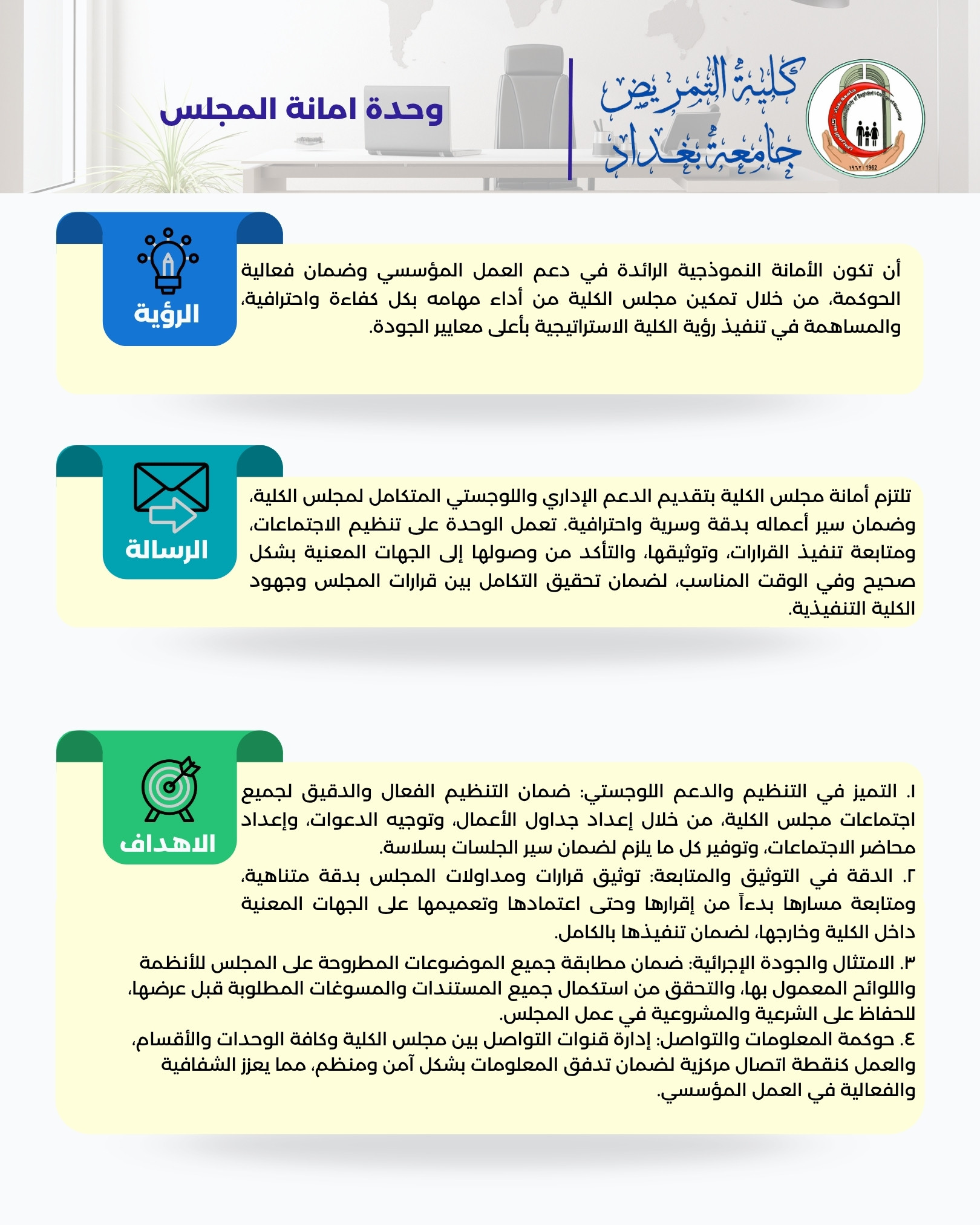 إن أمانة مجلس الكلية هي الجهة التي تعنى باجتماعات مجلس الكلية (أعلى سلطة علمية و إدارية في الكلية، والذي يتكون من عميد الكلية و رؤساء الأقسام العلمية و السادة معاونين العميد العلمي والإداري وامين مجلس الكلية ) وهي جهة مرتبطة بالعميد (رئيس مجلس الكلية) مباشرة. ويتولى أمين مجلس الكلية تنفيذ و متابعة قرارات مجلس الكلية الى أن تصل للجهات المعنية بتأييدها و من ثم الإشراف على إعادة توجيهها إلى الجهات ذات العلاقه المختلفة لتنفيذ القرارات سواء بداخل الكلية أو خارجها. وعلى ذلك فإن أمانة مجلس الكلية تعتبر إدارة تنفيذية تقوم بتسهيل مهام مجلس الكلية وتقديم كافة الخدمات الإدارية وأعمال السكرتارية لكل ما يتعلق بأعمال المجلس وترتبط ارتباط مباشر برئيس مجلس الكلية سعادة عميد الكلية