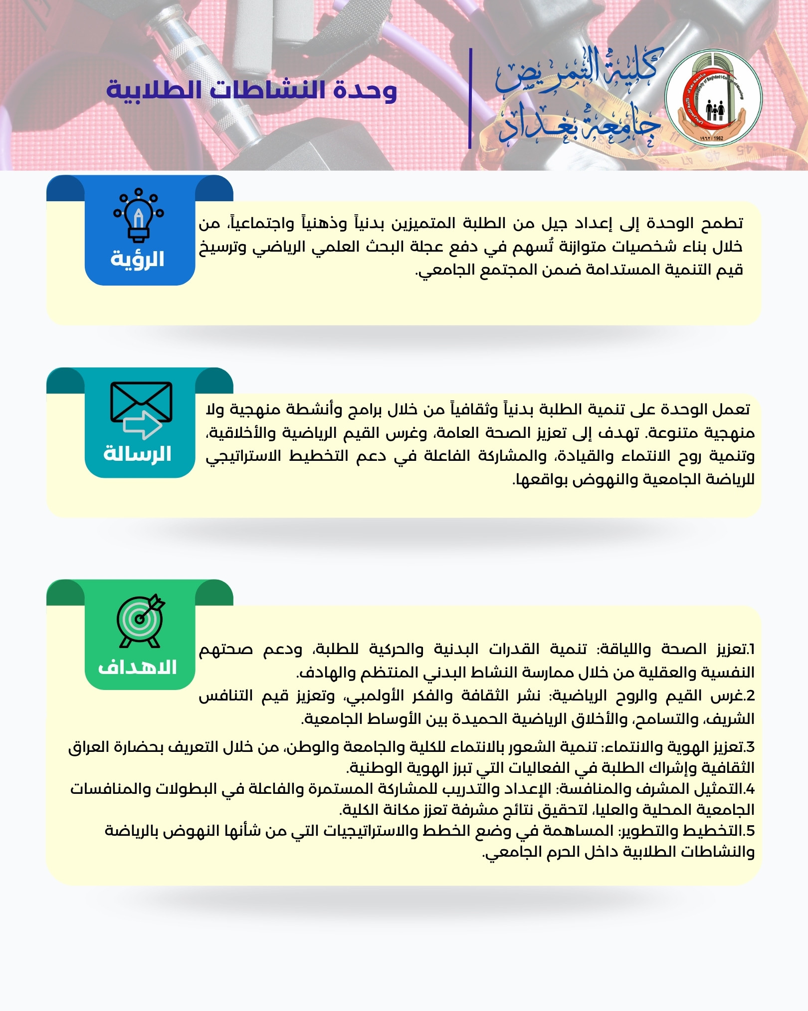 - العمل على تنظيم البطولات والمشاركات الثقافية بما يعزز مكانة الكلية في محافل الجامعة .