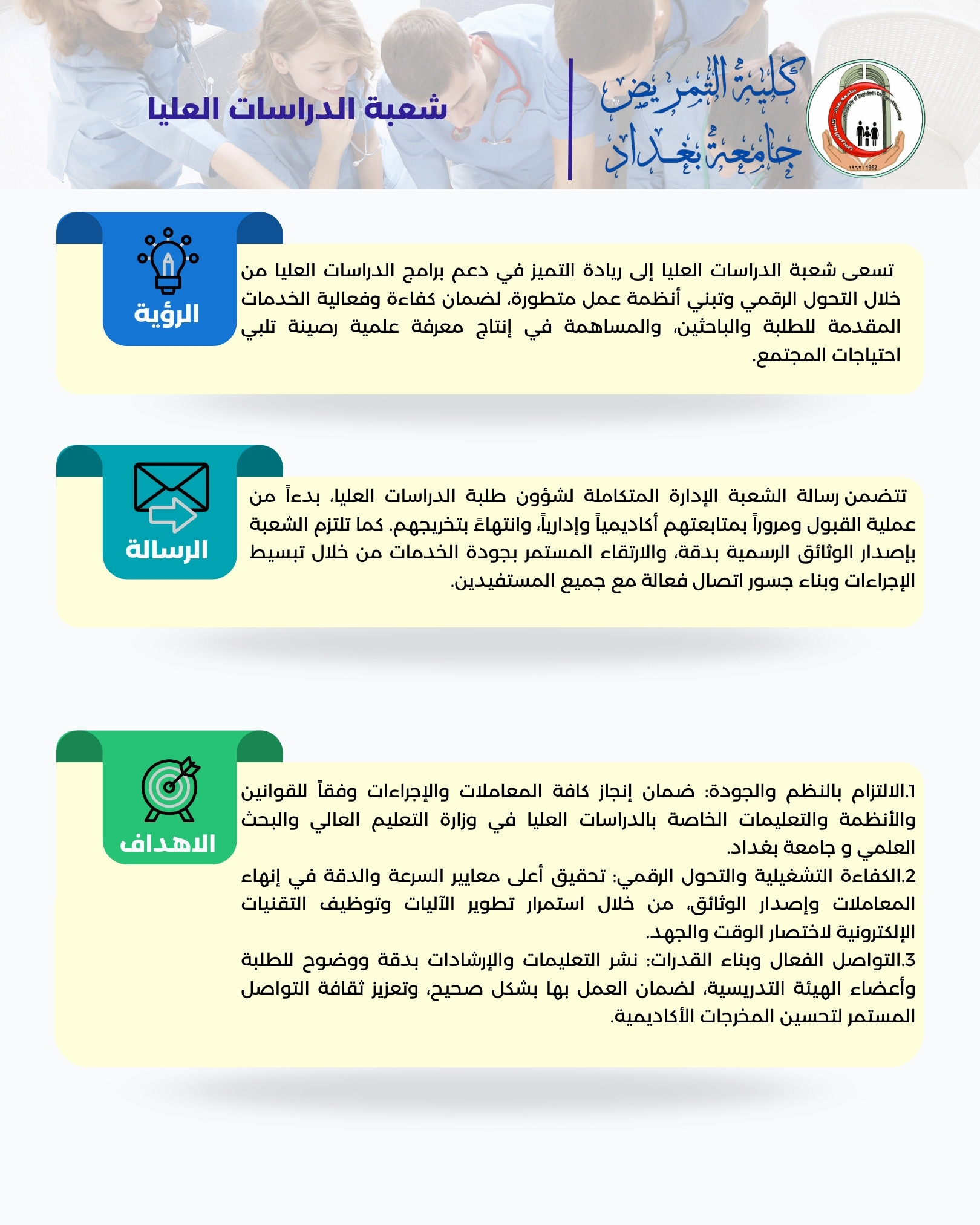 ١-وجدت شعبة الدراسات العليا لمتابعة شؤون طلبة الدراسات العليا بدا من قبولهم لحين تخرجهم